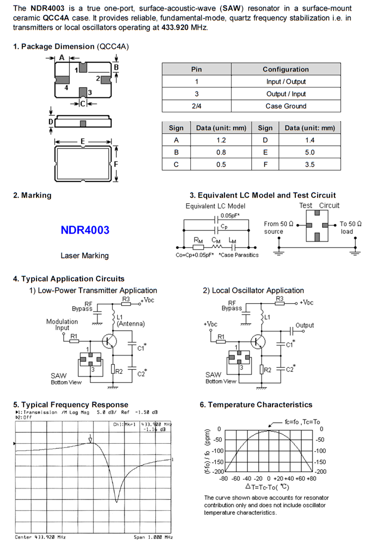- SAW声表谐振器 QCC4A R433M R433.92M